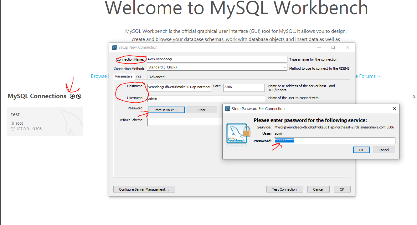 (2) 워크벤치에서 생성 누르고 - 커넥션네임에는 원하는 이름 - 호스트 네임에 RDS 엔드포인트 복붙 - 유저네임에 RDS 생성시 설정했던 아이디 - Store in vault 클릭후 비번 - ok