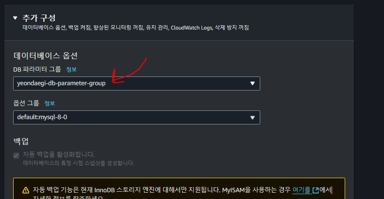 파라미터 그룹은 MySQL에서도 여러가지 설정값들이 있는데 파라미터 그룹을 사용해서 설정값을 쉽게 생성할 수 있다
