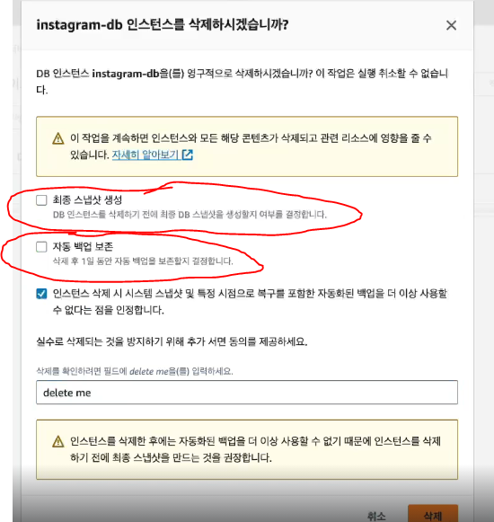 (체크 하고 삭제하면 비용 나간다!! 만약 체크하고 삭제했을시 RDS페이지 왼쪽에 스냅샵,자동백업 메뉴 들가서 삭제하면 된다)