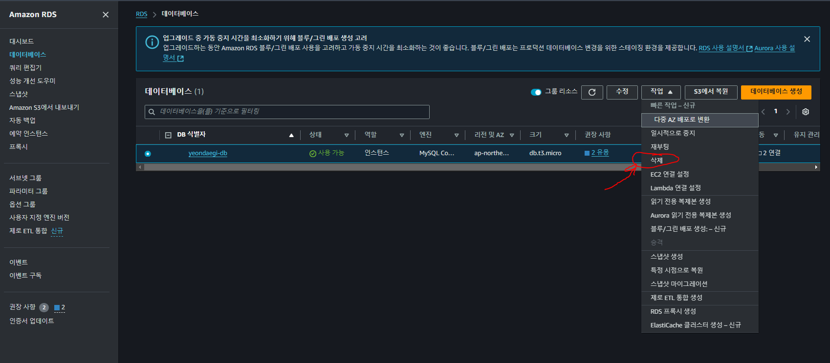 (1) RDS 해당 인스턴스 선택후 삭제 클릭
