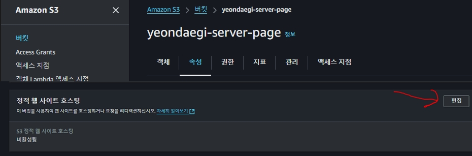 (5) 해당 버킷 들어가서 - 속성 - 정적 웹 사이트 호스팅 편집 클릭