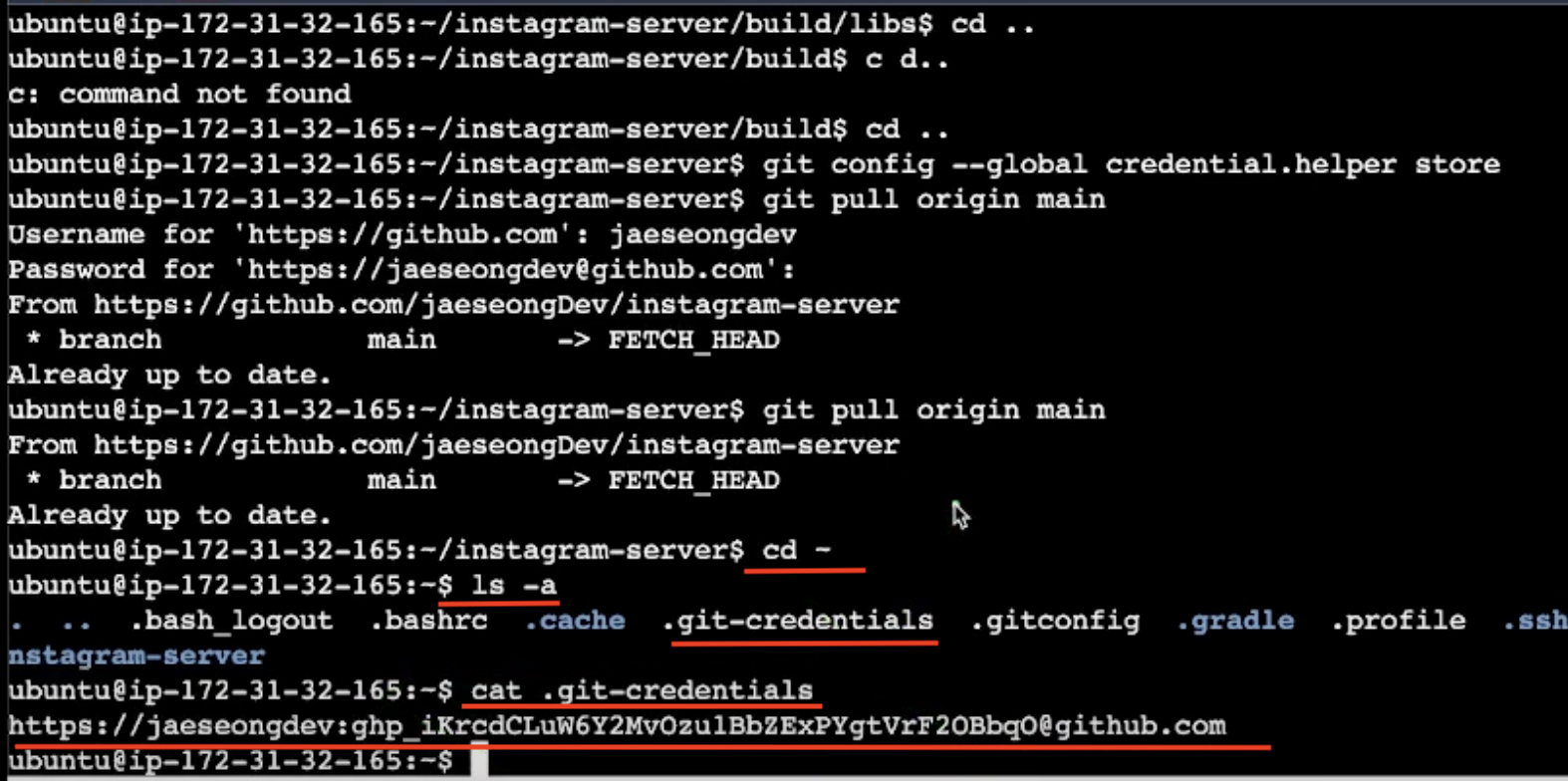 EC2 인스턴스의 최상위 경로(cd ~)에서 숨겨진 파일을 포함해 확인(ls -a)해보면, .git-credentials 라는 파일이 생성된 것을 볼 수 있습니다.