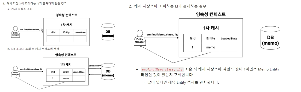 - Entity 조회 -> em.find(Memo.class, 1); 메소드로 캐시저장소 데이터 조회하는거고 매개변수 첫번째에는 entity객체,두번째에는 조회하려는 프라이머리키 id넣어준다.