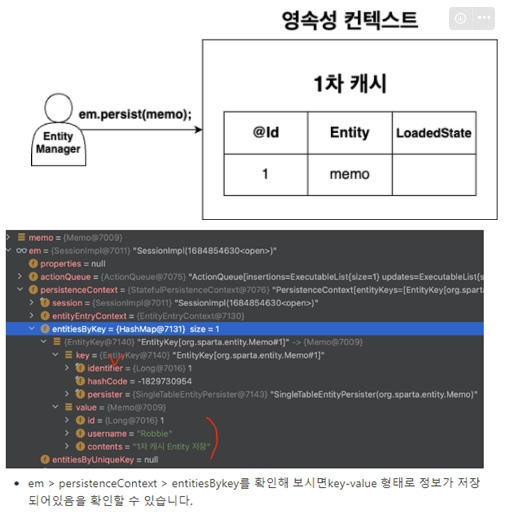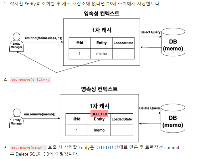- Entity저장 -> em.persist(memo); 메소드가 호출되면 memo Entity 객체를 캐시 저장소에 저장