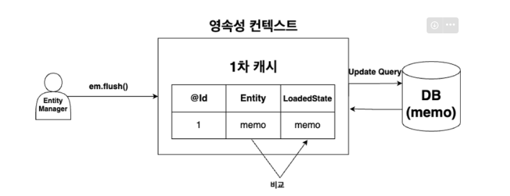 flush()가 호출되면 Entity의 현재 상태와 저장한 최초 상태를 비교하고 변경 내용이 있으면 Update SQL을 생성하여 쓰기 지연 저장소에 저장하고 모든 쓰기지연 저장소의 SQL을 DB에 요청하여 반영한다.
