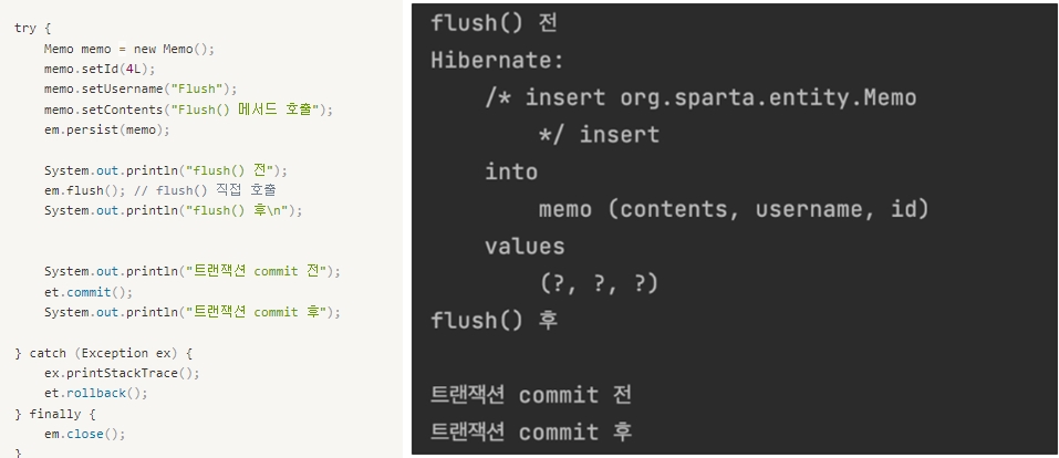 * 밑에 예시를 보면 직접 em.flush후 et.commit하고 오른쪽 결과 보니 flush호출하면 sql 기록이 나오고 이제 쓰기 지연 저장소에 entity객체가 없으니 commit을 해도 할게 없어서 sql기록이 안나온다