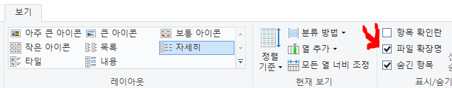 2. 보기탭에서 파일 확장자명을 클릭해준다.(지금은 클릭한 상태라 위에 1번 캡처에 .txt가 보인다)