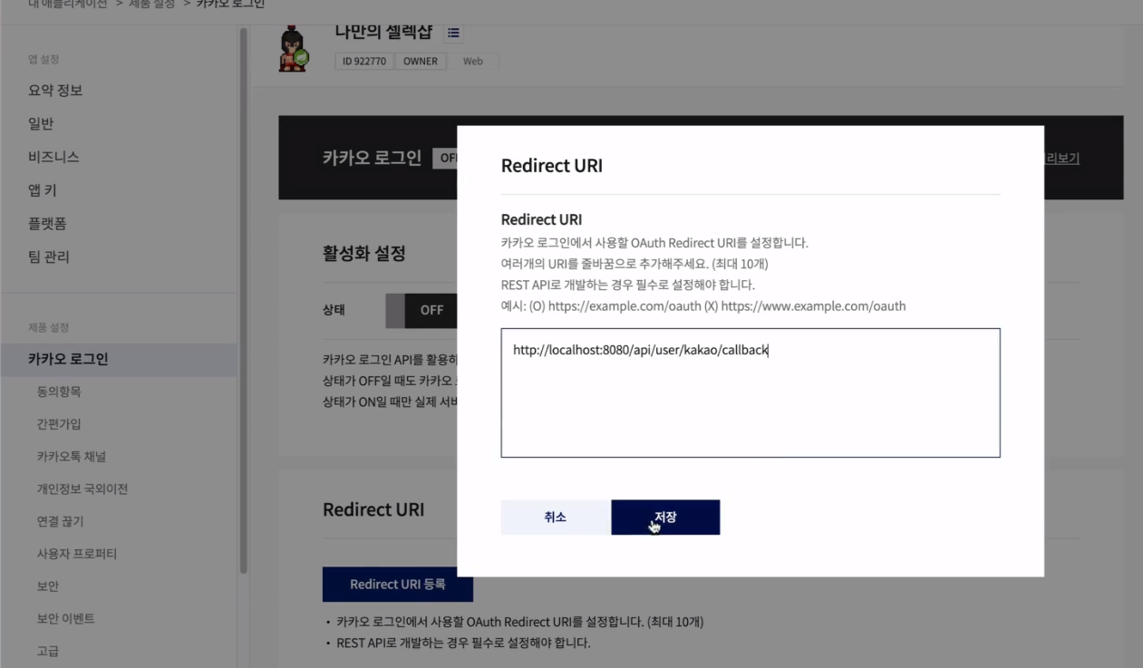 (2) 카카오 로그인-Redirect Url 등록 하고 활성화 on 해준다
