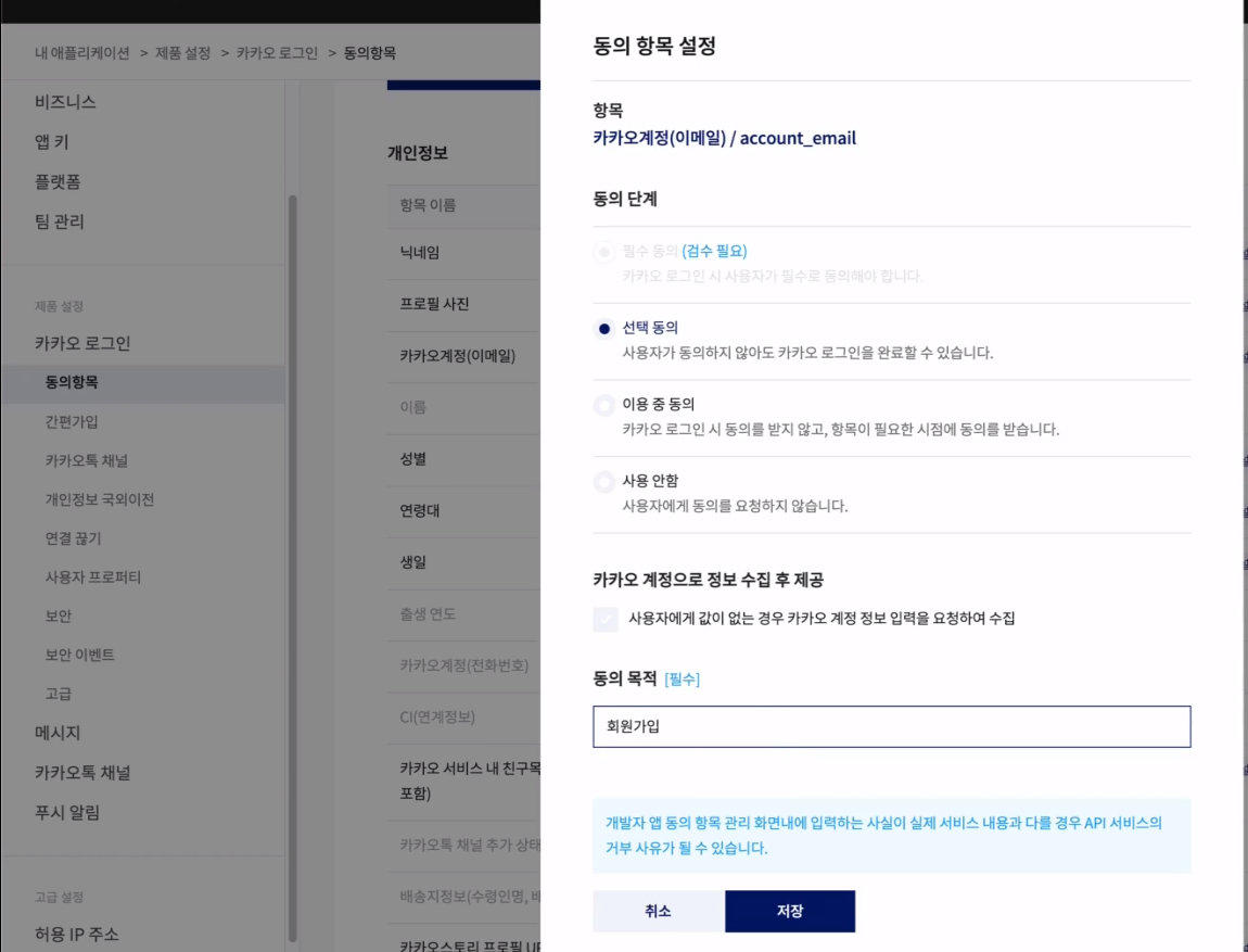 (3) 동의 항목에서 닉네임은 필수 ,카카오계정(이메일)은 선택으로 하고 둘다 목적을 회원가입으로 한다.