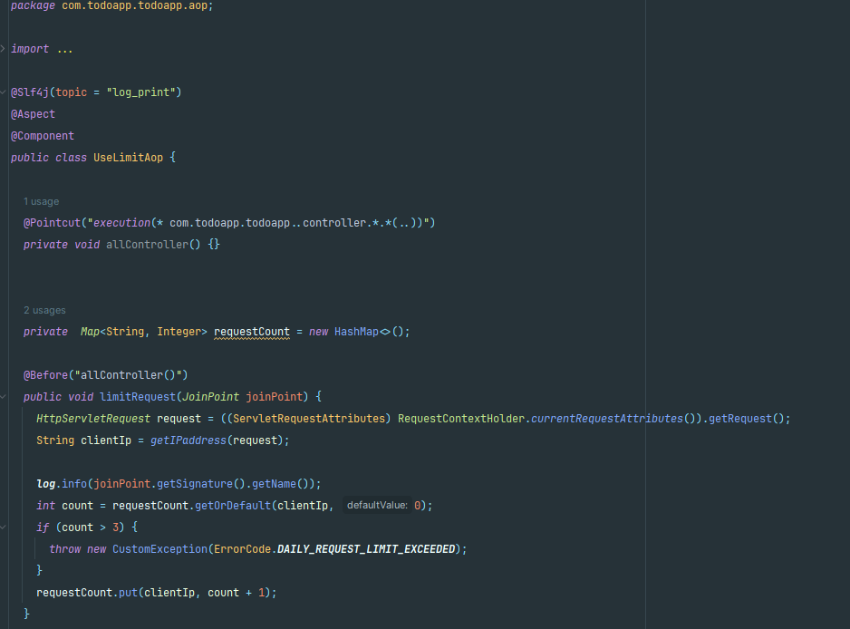 관리자가 특정 회원 차단하거나 특정 ip를 차단같은 기능이 생각나서 일단 기본적으로 동일 ip가 컨트롤러의 모든 기능 3번 이용 초과시 이용 못하게 해봤다.(연습이니 DB에 저장 생략해서 서버가 작동중일때만 체크)
