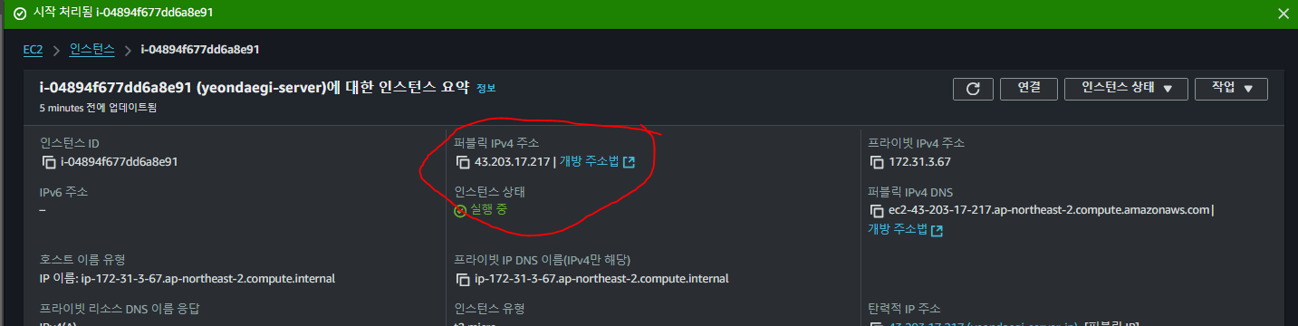 이후 대시보드가서 인스턴스 확인해보면 탄력적 ip주소로 변경되어 있다.(이러고 인스턴스 중지,실행해도 안변한다)