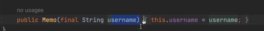 위에 memo클래스의 username에 final이 있을시 RequiredArgsConstructor하면 ↓ 생성된다.