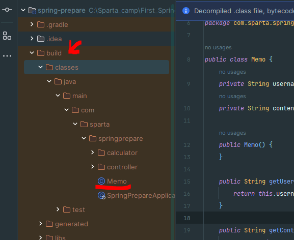 *예시로 이 코드가 있을때 먼저 오른쪽 상단에 Gradle-Tasks-build에서 build 더블클릭. 그리고 잘 생성됬나 확인하는 방법은 build패키지의 clases에서 보면 된다.